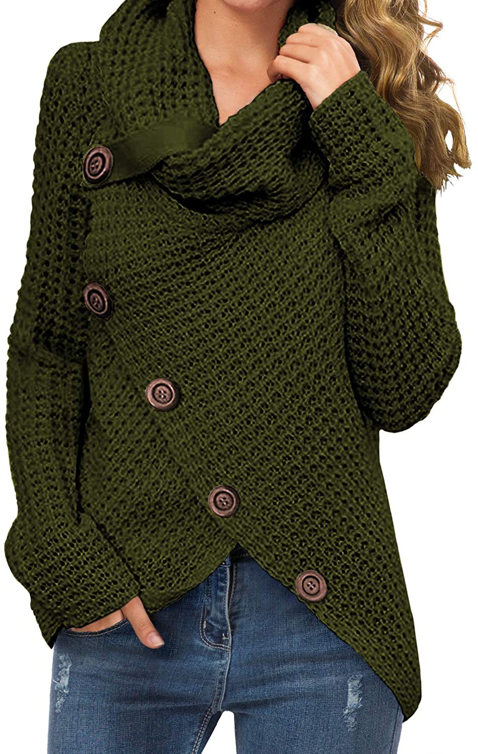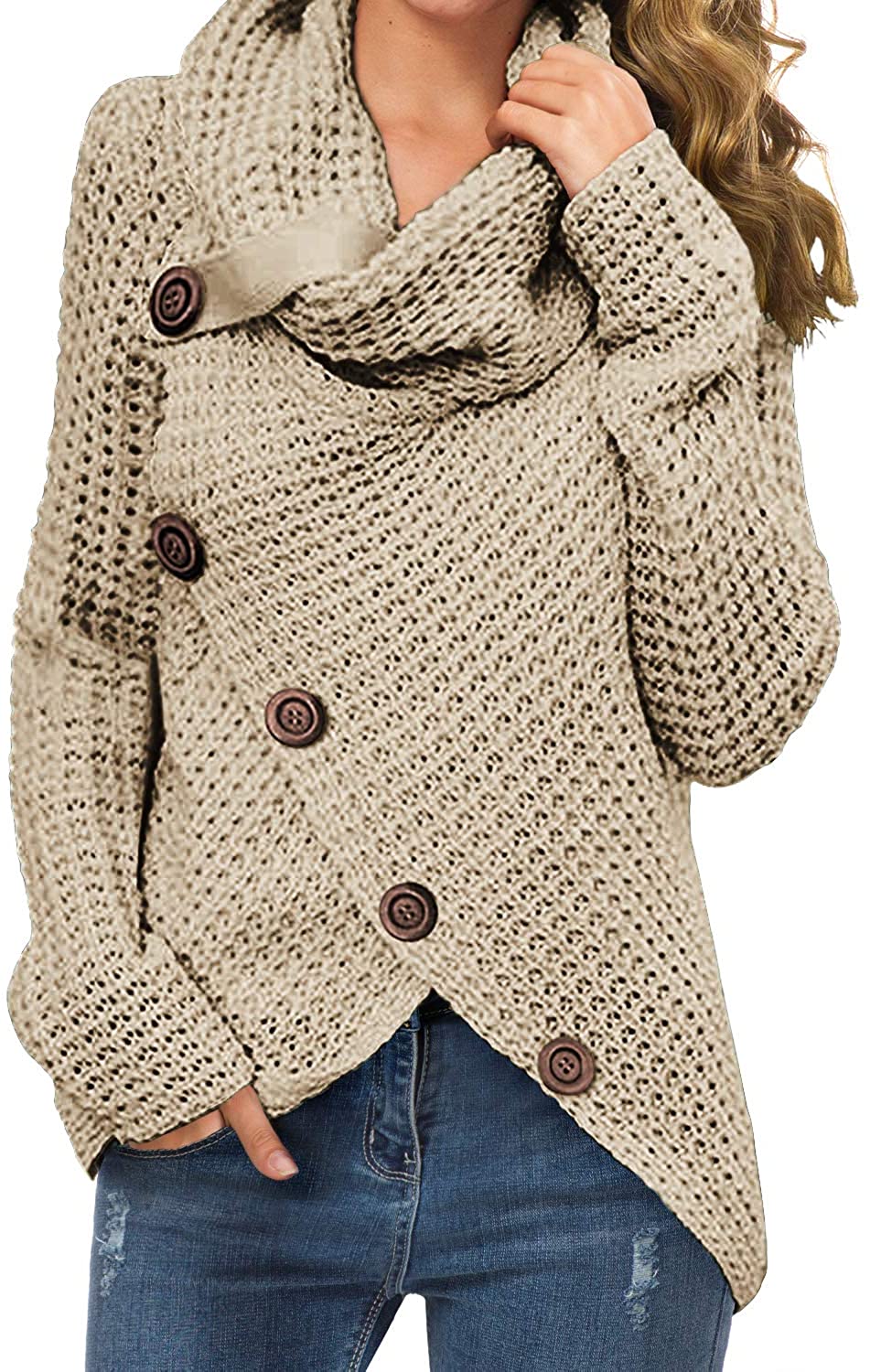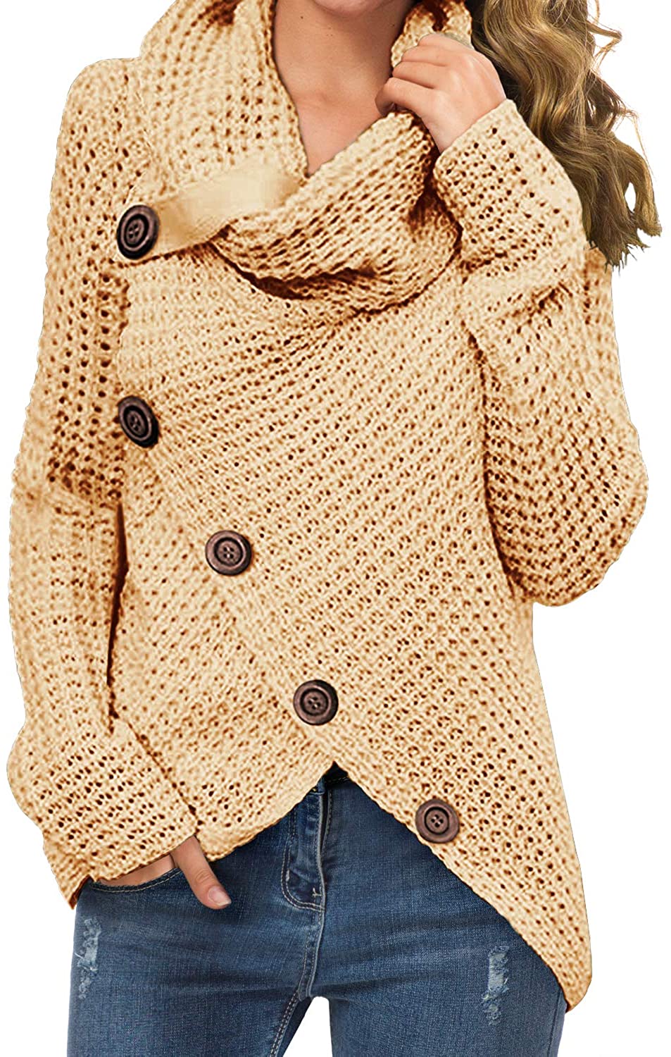 Features : chunky pullover knit sweater, and the autumn and winter seasons are very comfortable and warm;casual style, turtle cowl neck,cross-wrap design,long sleeve,asymmetric hem,button details is a very cute design(The buttons are decoration only,not functional).