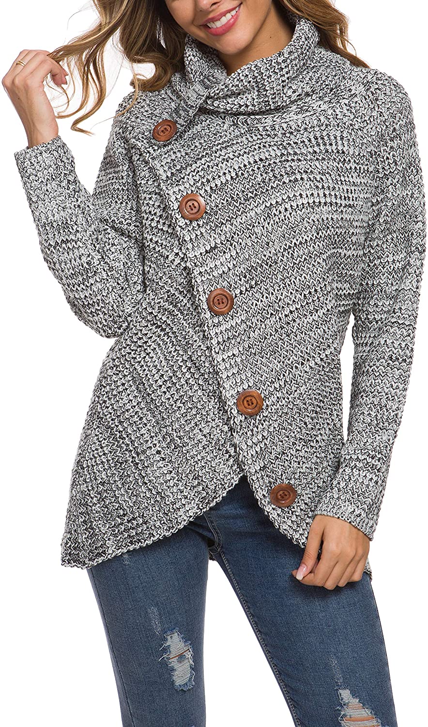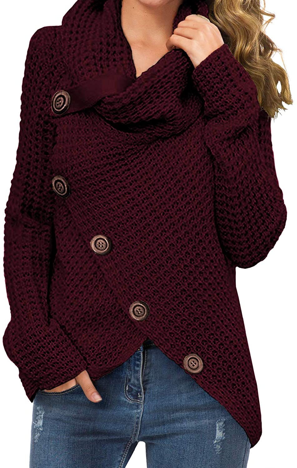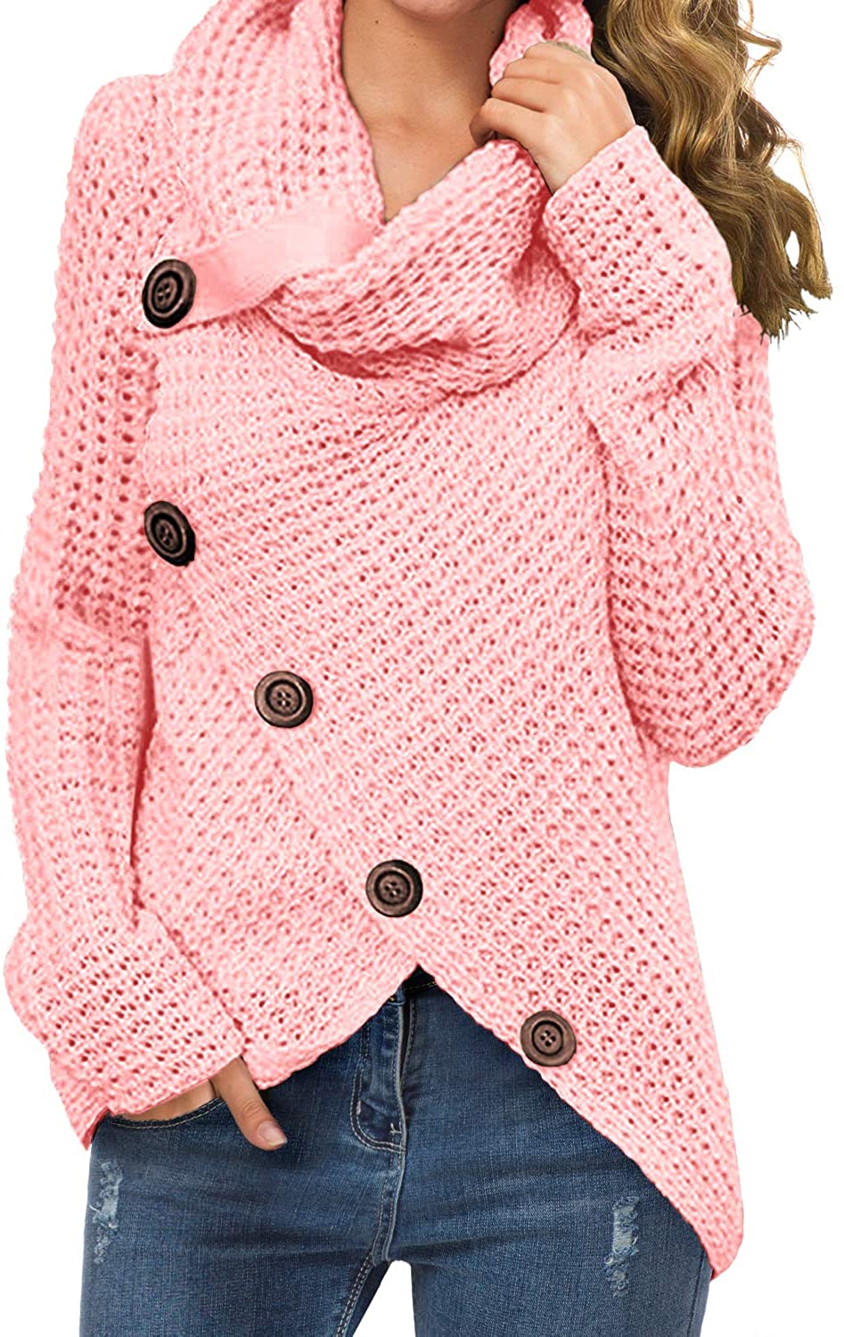 Features : chunky pullover knit sweater, and the autumn and winter seasons are very comfortable and warm;casual style, turtle cowl neck,cross-wrap design,long sleeve,asymmetric hem,button details is a very cute design(The buttons are decoration only,not functional).